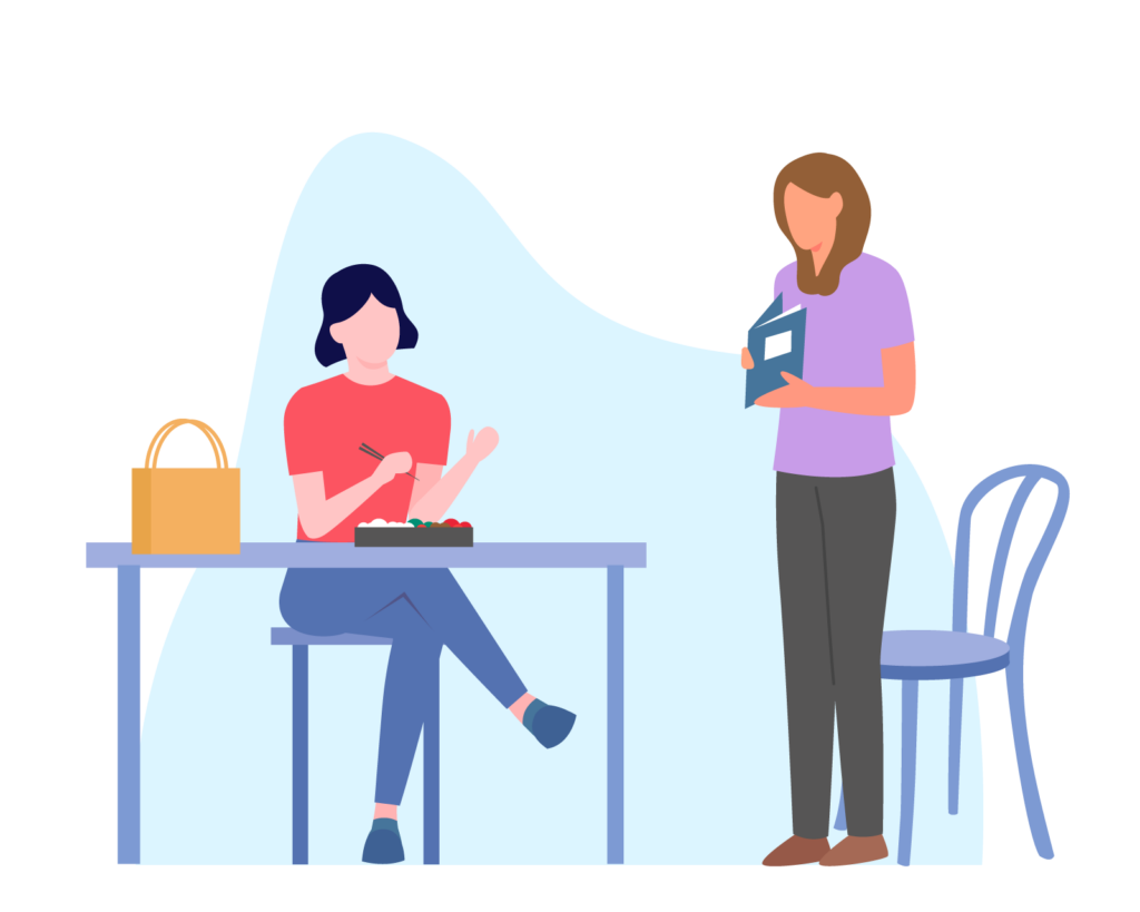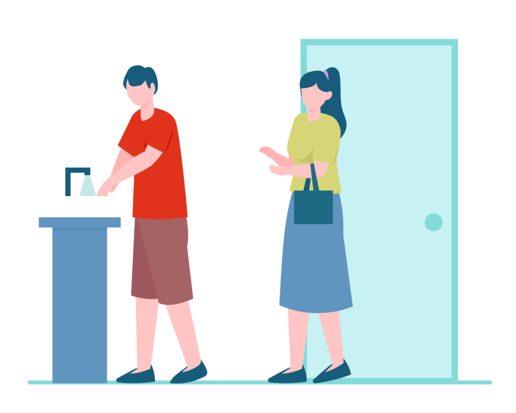 手洗い・手指消毒・検温をして入室。席札をお渡しするので、朝礼までの時間は自席や休憩スペースでリラックスして待機。